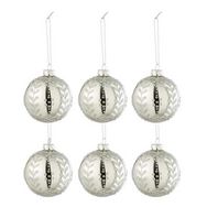 Informations Techniques : Dimensions : D. 8 x H. 8 cm Matière : Verre Spécificités : Tendance & Moderne Lot de 6 Boules de Noël Forme Ronde Design Feuilles Avec Paillettes Effet Brillant Poids : 0,026 kg Couleur : Argent