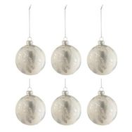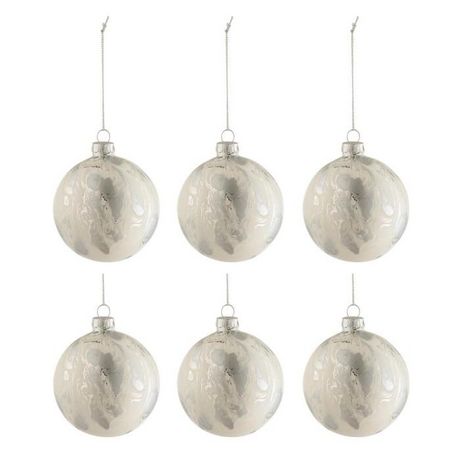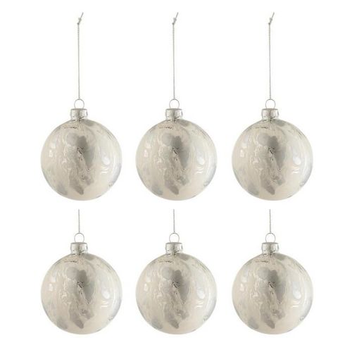 Informations Techniques : Dimensions : D. 8 x H. 8 cm Matière : Verre Spécificités : Chic & Festif Lot de 6 Boules de Noël Forme Ronde Design Marbre Poids : 0,023 kg Couleur : Blanc & Argent
