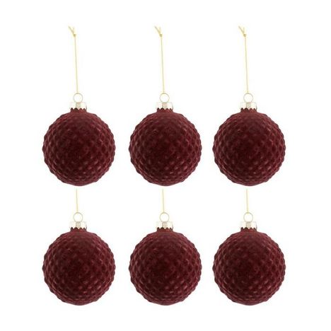 Informations Techniques : Dimensions : D. 8 x H. 8 cm Matière : Verre Spécificités : Chic & Festif Lot de 6 Boules de Noël Forme Ronde Motifs Velours Poids : 0,025 kg Couleur : Bordeaux