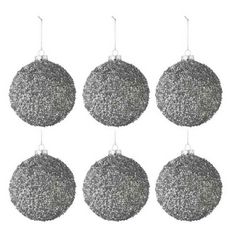 Informations Techniques : Dimensions : D. 8 x H. 8 cm Matière : Verre Spécificités : Pratique & Chic Lot de 6 Boules de Noël Forme Ronde Avec Paillettes Verre Fumé Poids : 0,059 kg Couleur : Gris