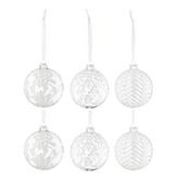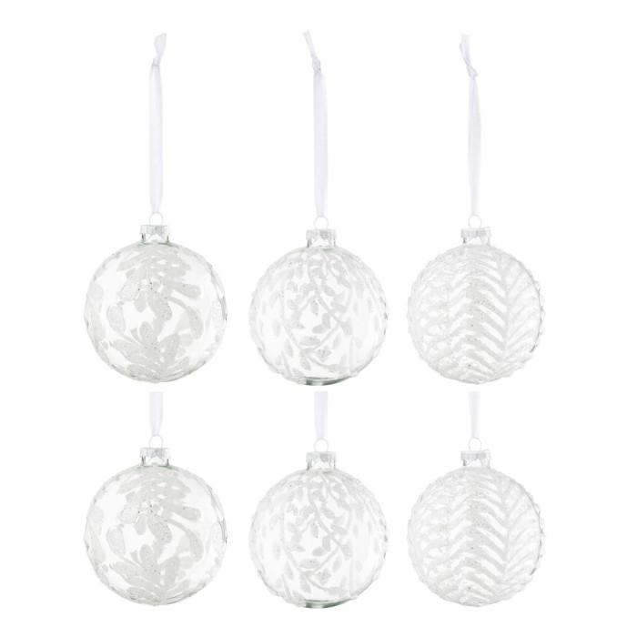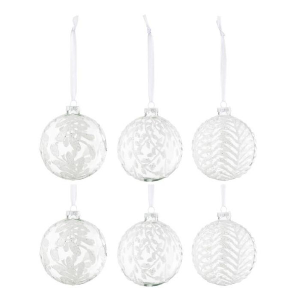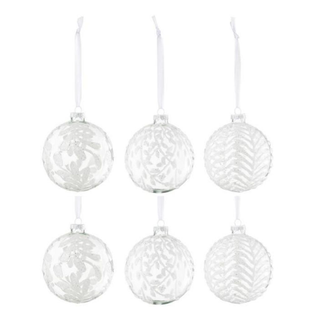 Informations Techniques : Dimensions : D. 10 x H. 10 cm Matière : 100% Verre Spécificités : Chic & Festif Lot de 6 boules de Noël À suspendre Motifs feuilles Avec paillettes Forme ronde Poids : 0,04 kg Couleur : Blanc