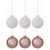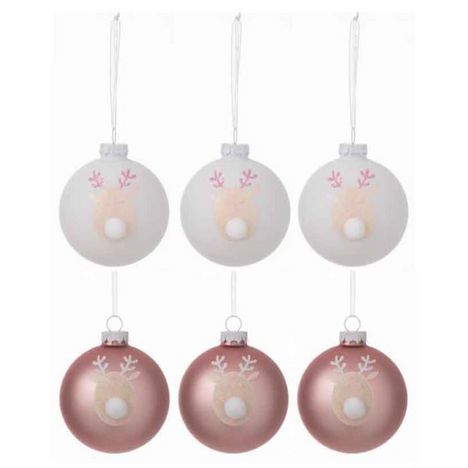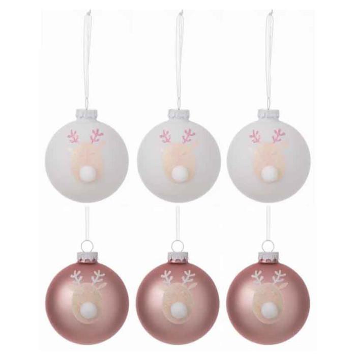 Lot de 6 Boules de Noël Rennes 8cm Rose & Blanc