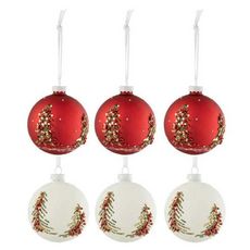 Informations Techniques : Dimensions : D. 8 x H. 8 cm Matière : Verre Spécificités : Tendance & Moderne Lot de 6 Boules de Noël Forme Ronde Design Sapin de Noël Avec Paillettes Poids : 0,024 kg Couleur : Blanc & Rouge