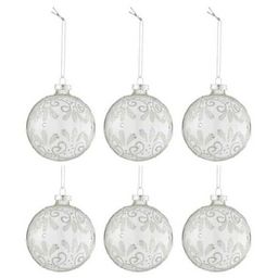 Informations Techniques : Dimensions : D. 8 x H. 8 cm Matière : Verre Spécificités : Tendance & Moderne Lot de 6 Boules de Noël Forme Ronde Avec Sequins Poids : 0,026 kg Couleur : Argent & Transparent