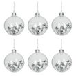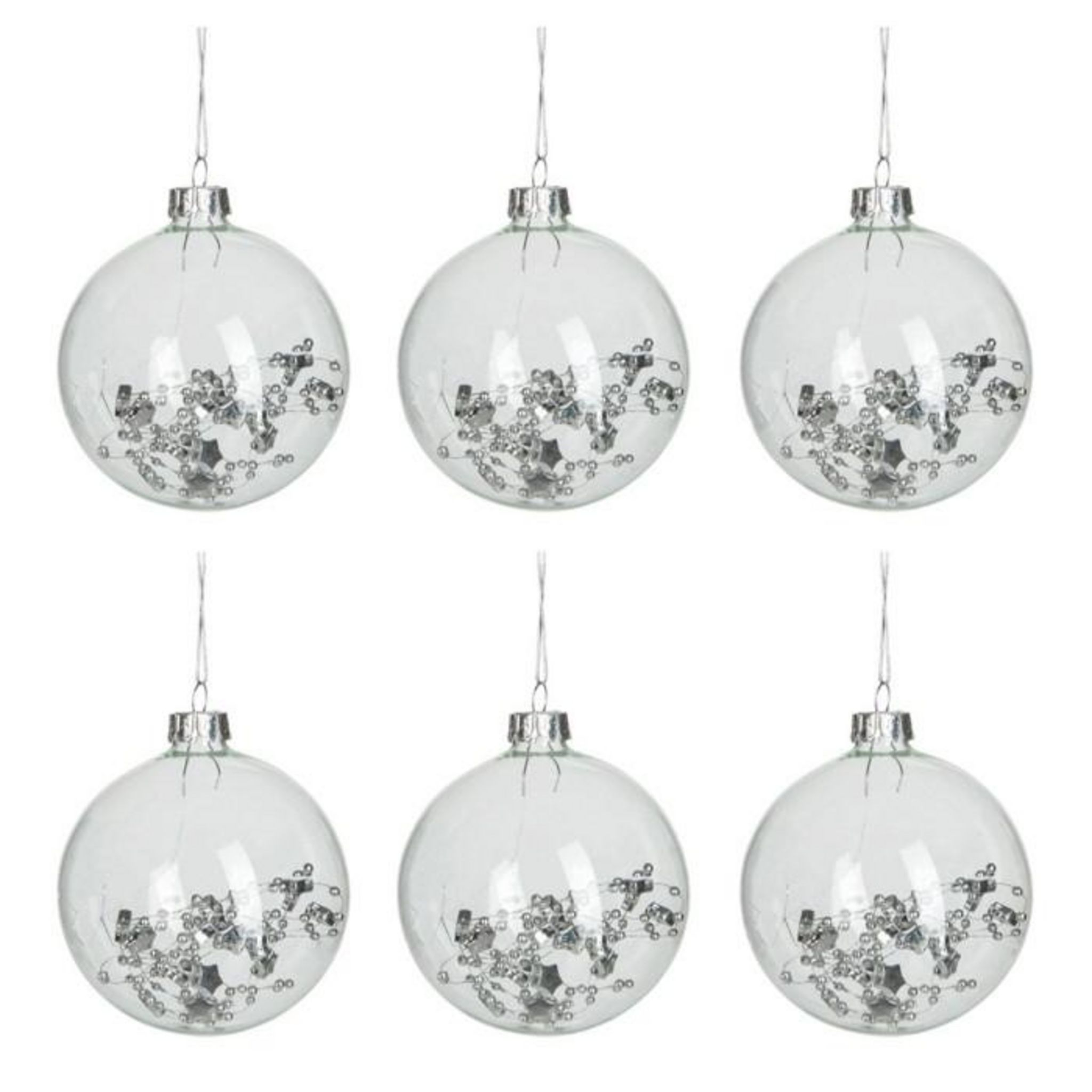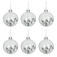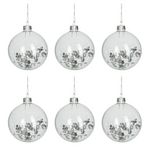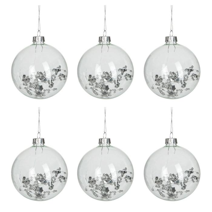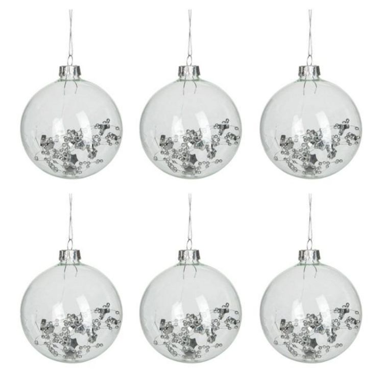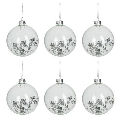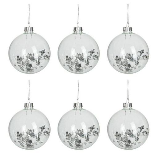 Informations Techniques : Dimensions : L. 8 x l. 8 x H. 9,5 cm Matière : Verre Spécificités : Tendance & Design Lot de 6 Boules de Noël Forme Ronde Avec Sequins Poids : 0,02 kg Couleur : Transparent
