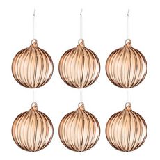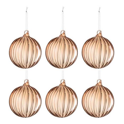 Informations Techniques : Dimensions : D. 8 x H. 8 cm Matière : 100% Verre Spécificités : Élégant & Raffiné Lot de 6 boules de Noël À suspendre Avec stries Forme ronde Poids : 0,03 kg Couleur : Marron Clair