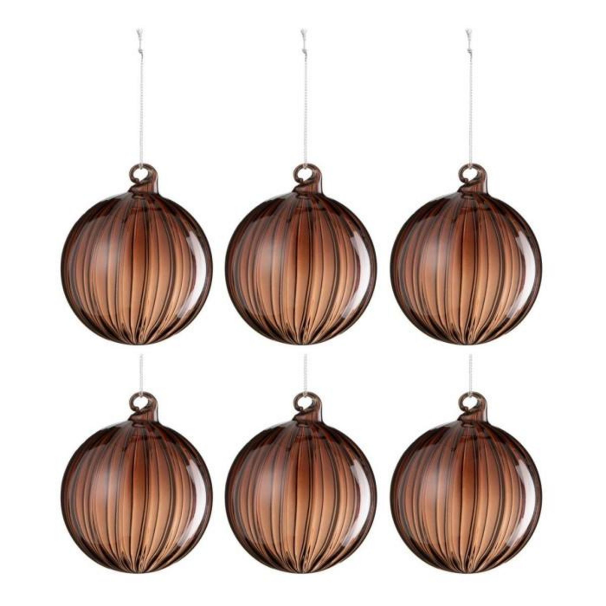 Informations Techniques :	 Dimensions : D. 8 x H. 8 cm	 Matière : 100% Verre	 Spécificités :	 Élégant & Raffiné	 Lot de 6 boules de Noël	 À suspendre	 Avec stries	 Forme ronde	 Poids : 0,03 kg	 Couleur : Marron Foncé