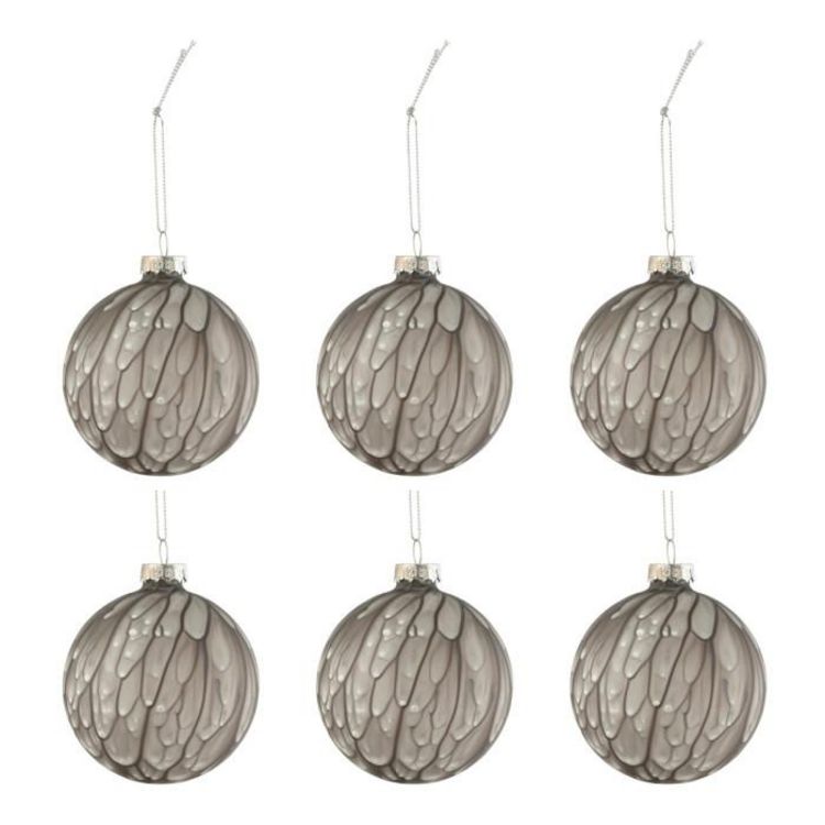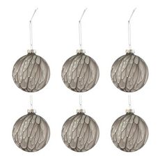 Informations Techniques : Dimensions : D. 8 x H. 8 cm Matière : Verre Spécificités : Pratique & Chic Lot de 6 Boules de Noël Forme Ronde Design Tâche Mat Poids : 0,024 kg Couleur : Gris
