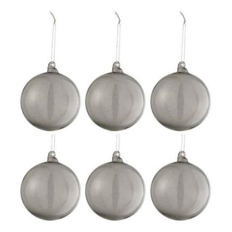 Informations Techniques : Dimensions : D. 8 x H. 8 cm Matière : Verre Spécificités : Tendance & Chic Lot de 6 Boules de Noël Forme Ronde Verre Épais Poids : 0,03 kg Couleur : Gris