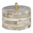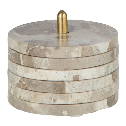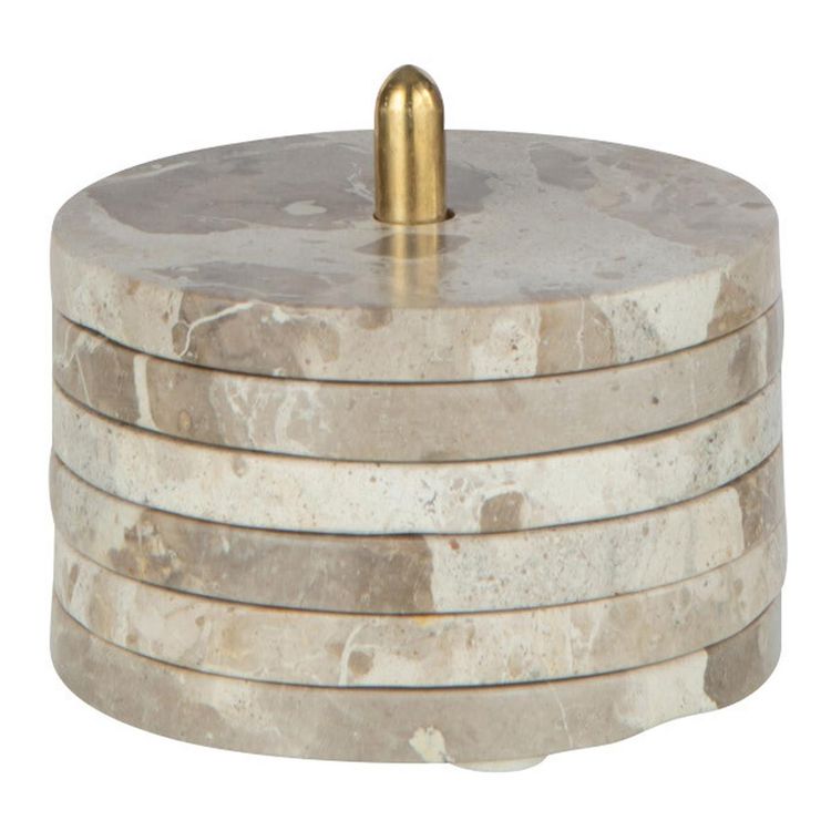 Informations Techniques : Dimensions : L. 10 x l. 10 x H. 12 cm Matières : 95% Marbre & 5% Laiton Spécificités : Pratique & Utile Lot de 6 dessous de verre Avec socle de rangement Forme ronde Poids : 1,6 kg Couleur : Beige
