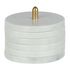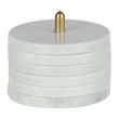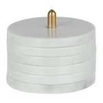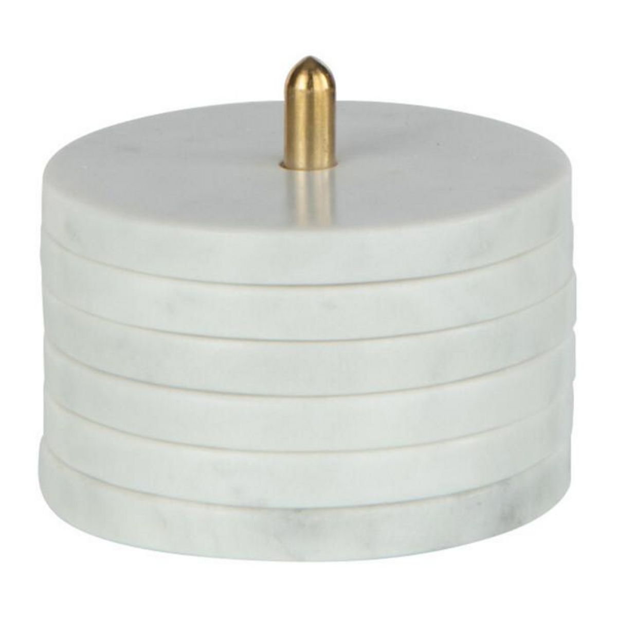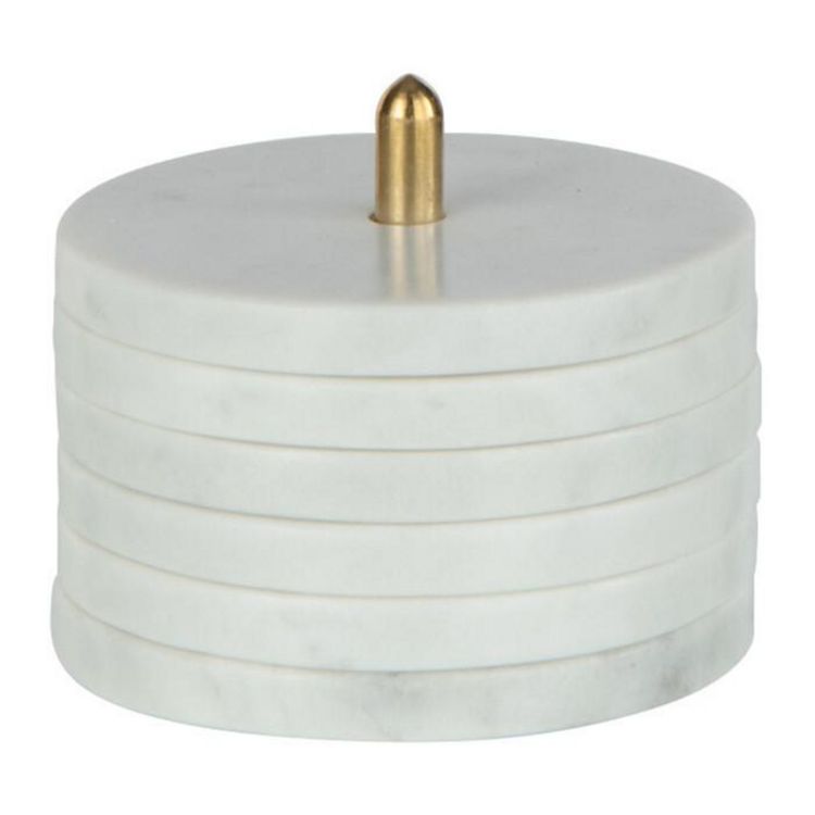 Informations Techniques : Dimensions : L. 10 x l. 10 x H. 12 cm Matières : 95% Marbre & 5% Laiton Spécificités : Pratique & Utile Lot de 6 dessous de verre Avec socle de rangement Forme ronde Poids : 1,6 kg Couleur : Blanc