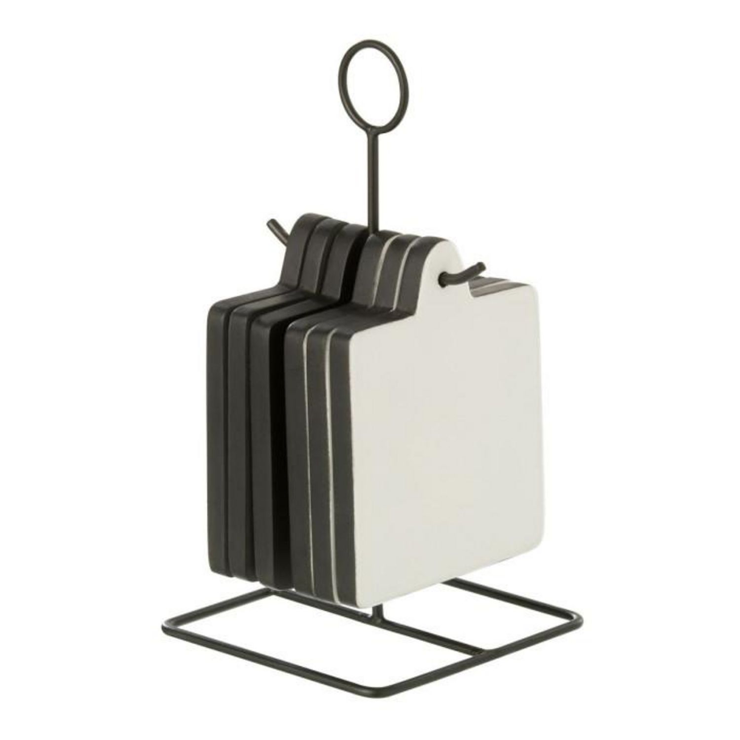 Informations Techniques : Dimensions : L. 10,5 x 11,5 x H. 23 cm Matière : Bois Spécificités : Moderne & Utile Lot de 6 dessous de table Forme carrée Poids : 0,63 kg Couleur : Noir & Blanc