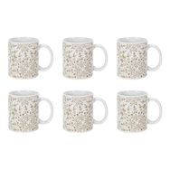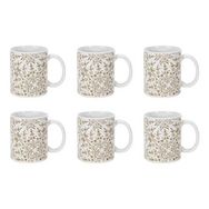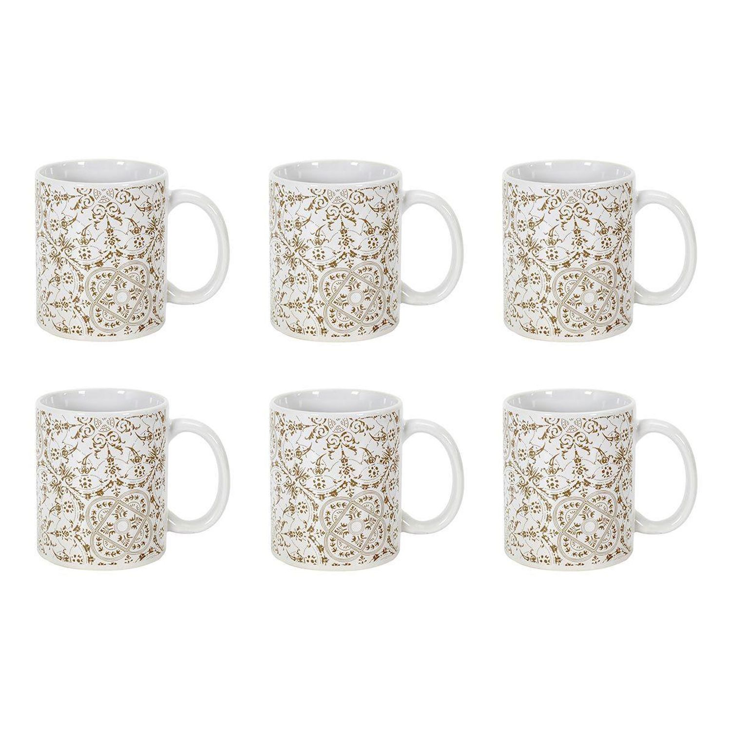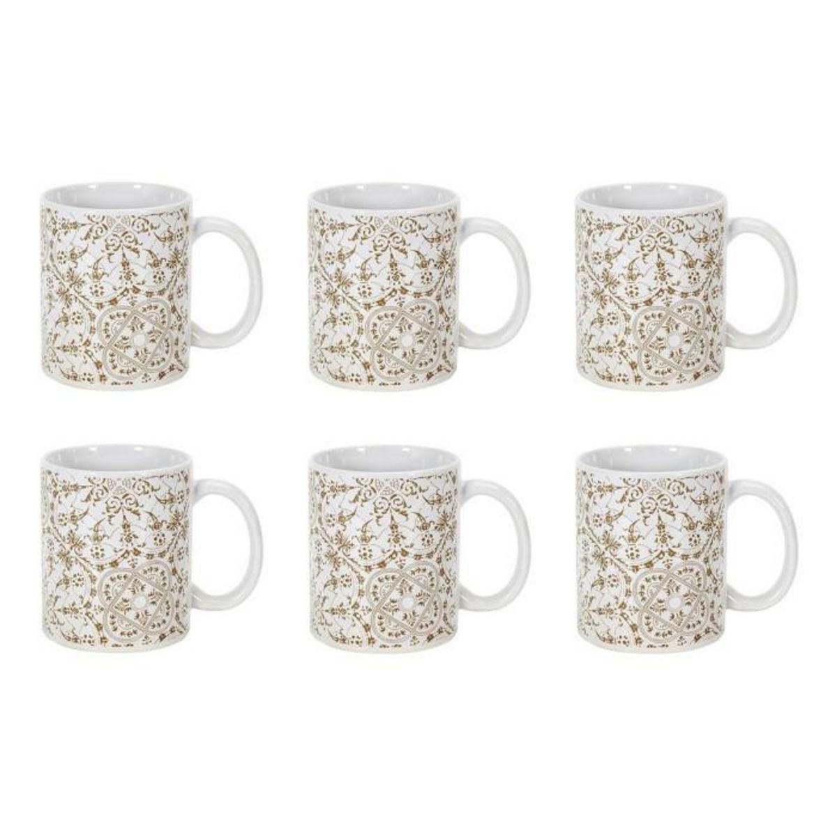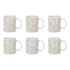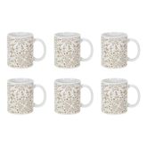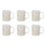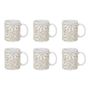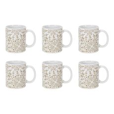 Informations Techniques : Dimensions : L. 12,5 x l. 8 x H. 9,2 cm Matière : 100% Grès Spécificités : Élégant & Design Lot de 6 mugs avec anse Imprimé faience Forme ronde Compatible : Lave-vaisselle, Micro-ondes, Four & Congélateur Poids : 0,32 kg (à l'unité) Couleur : Blanc & Taupe
