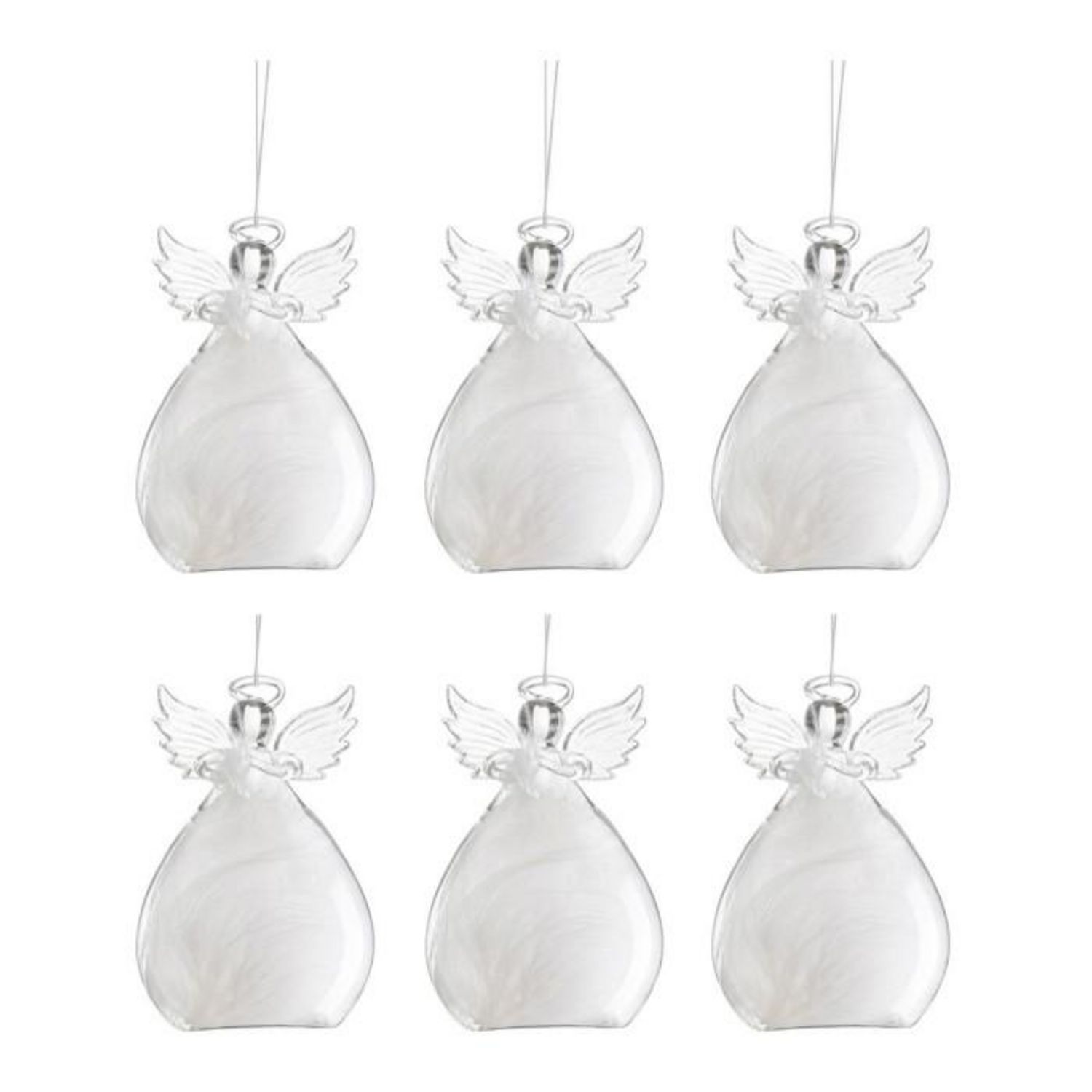 Informations Techniques : Dimensions : D. 7,8 x H. 11,4 cm Matière : 100% Verre Spécificités : Élégant & Original Lot de 6 sujets de Noël Design ange Avec plumes Poids : 0,06 kg Couleur : Transparent & Blanc