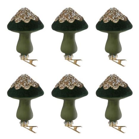 Informations Techniques : Dimensions : D. 6 x H. 10 cm Matières : Verre & velours Spécificités : Unique & Festif Lot de 6 sujets de Noël À clipper Design champignon Avec paillettes Poids : 0,02 kg Couleur : Vert