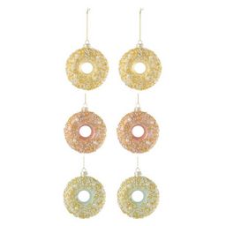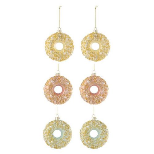 Informations Techniques : Dimensions : L. 9 x l. 3,5 x H. 9,5 cm Matière : Verre Spécificités : Déco & Original Lot de 6 sujets de Noël À suspendre Design donuts Avec paillettes Poids : 0,04 kg Couleur : Multicolore