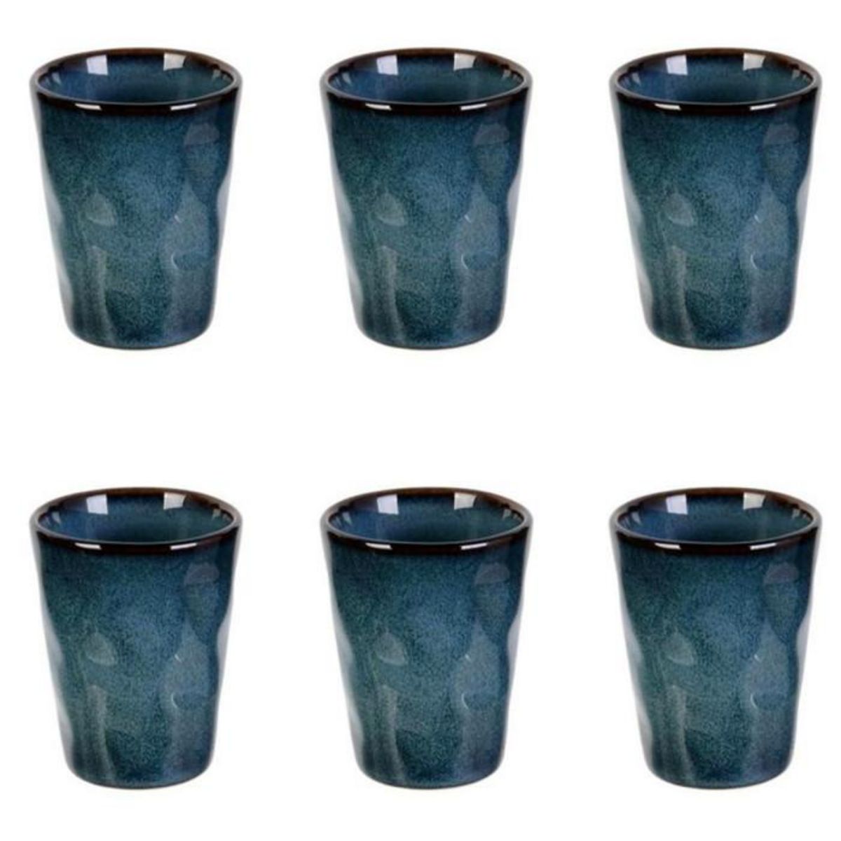 Informations Techniques : Dimensions : L. 6 x l. 6 x H. 7,4 cm Contenance : 10 cl Matière : Céramique Spécificités : Design & Original Lot de 6 Tasses Déco Design Uni Chaque pièce est unique et présente des variations de teintes et finitions Couleur : Bleu