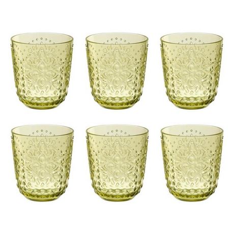 Informations Techniques : Dimensions : D. 9,6 x H. 10,6 cm Matière : 100% Plastique Spécificités : Coloré & Robuste Lot de 6 verres Motifs en relief Compatible lave-vaisselle Capacité : 47,3 cl Poids : 0,1 kg Couleur : Vert