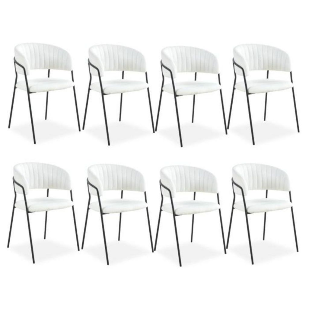 Informations Techniques : Dimensions : L. 53,5 x l. 52,5 x H. 79 cm Assise : H. 45,5 cm Matières : Revêtement : Tissu Structure : Métal Spécificités : Élégant & Confortable Lot de 8 chaises design Coutures verticales décoratives Dossier arrondi Assise et dossier matelassés Tissu bouclette Nombre de
