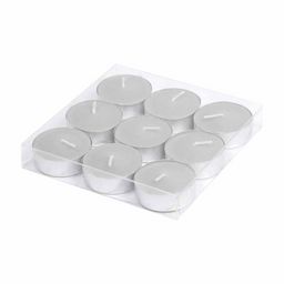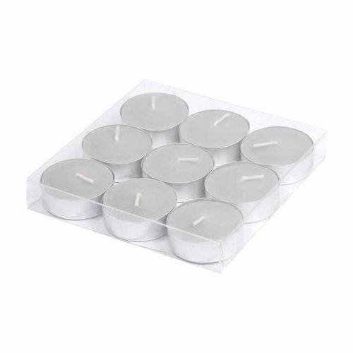 Informations Techniques : Dimensions : D. 3,7 x H. 1,5 cm Matières : Cire & Aluminium Spécificités : Indispensable & Pratique Lot de 9 bougies Chauffe-Plat Forme Ronde Facile d'Utilisation Facile à Transporter Senteur : Musc Couleur : Gris