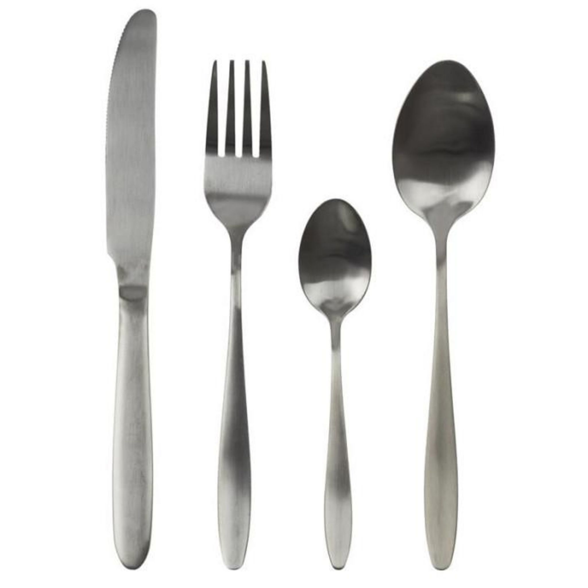 Contient 4 fourchettes, 4 couteaux, 4 cuillères à soupe & 4 cuillères à café