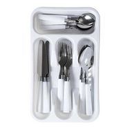 Informations Techniques : Dimensions : L. 32 x l. 19 x H. 4 cm Matières : Acier Inoxydable & Polypropylène Spécificités : Pratique & Utile Ménagère 16 pièces Avec range-couverts Compatible lave-vaisselle Contient : 4 x fourchettes 4 x couteaux 4 x cuillères à soupe 4 x cuillères à café 1 x range-cou