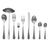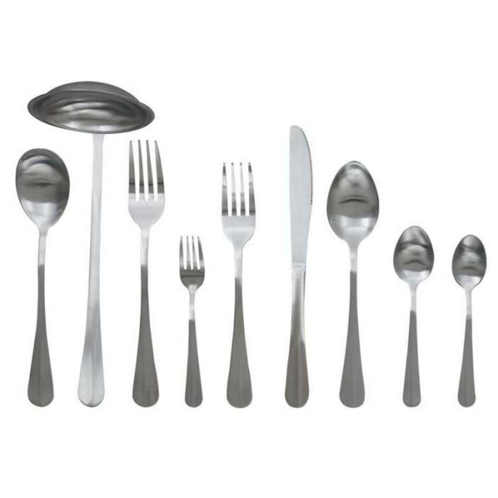 Contient 6 Cuillères à Soupe, 6 Cuillères à Café, 6 Fourchettes, 6 Couteaux, 6 Fourchettes à Dessert, 6 Cuillères à Thé, 1 Louche, 1 Cuillère de Service & 1 Fourchette de Service