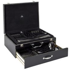 Informations Techniques : Dimensions : L. 45 x l. 33,5 x H. 14 cm Matières : Métal, Bois & Acier Inoxydable Spécificités : Design & Pratique Ménagère 84 Pièces Coffret en Bois avec Tiroir Forme Rectangulaire Lave vaisselle : Non Facile d'Utilisation Couleur : Noir