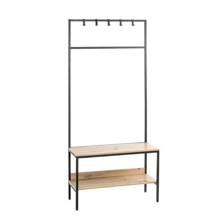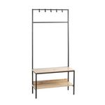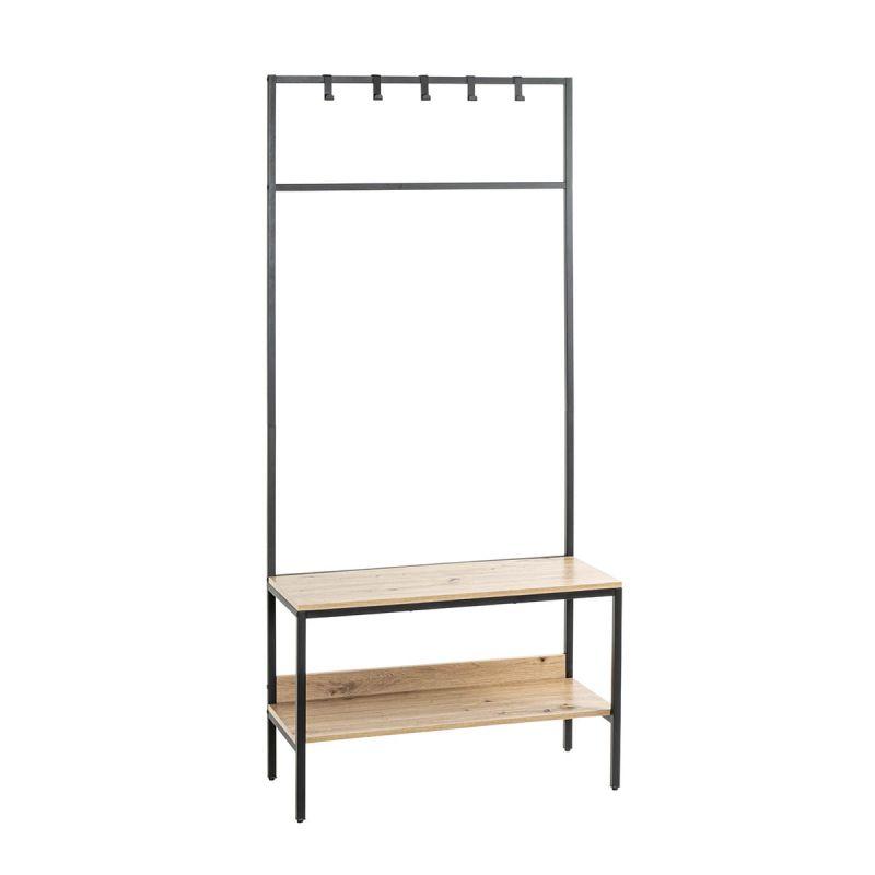 Informations Techniques : Dimensions : L. 80 x l. 35 x H. 180 cm Matières : Structure : Acier Plateau : Panneaux de particule Spécificités : Tendance & Pratique Vestaire d'entrée Avec 5 crochets et 2 plateaux Décor chêne Peut servir de porte manteaux, de meuble à chaussures ou bien de banc Livre n