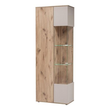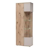 Informations Techniques : Dimensions : L. 70 x l. 40 x H. 197 cm Matières : MDF, Panneau stratifié, Feuille de PVC & Verre Spécificités : Pratique & Utile Meuble de rangement haut 8 étagères dont 2 en verre 2 portes dont 1 partiellement vitrée Design rainuré Finition mate Éclairage LED inclus Ouvert