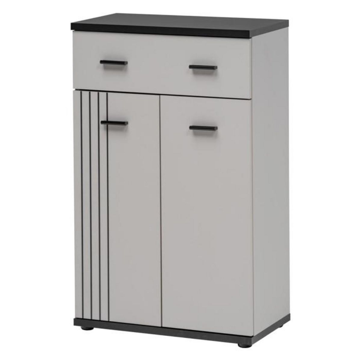 Informations Techniques : Dimensions : L. 60 x l. 32 x H. 96 cm Matière : MDF Spécificités : Fonctionnel & Utile Meuble de rangement 1 tiroir et 2 portes Avec étagères intérieures Imprimé à rayures noires Finition mate Nombre de colis : 1 Poids : 24,25 kg Couleur : Gris & Noir
