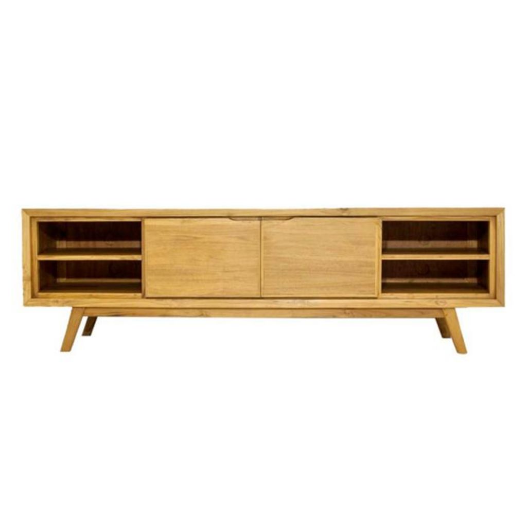 Informations Techniques : Dimensions : Meuble TV : L. 180 x P. 45 x H. 55 cm (hauteur du piètement 18 cm) Porte centrale x 2 : L. 42,5 x P. 40,5 x H. 31 cm Niche du haut x 2 : L. 45 x P. 41 x H. 16,5 cm Niche du bas x 2 : L. 45 x P. 41 x H. 13 cm Matières : Bois & Teck Spécificités : Le teck est iss