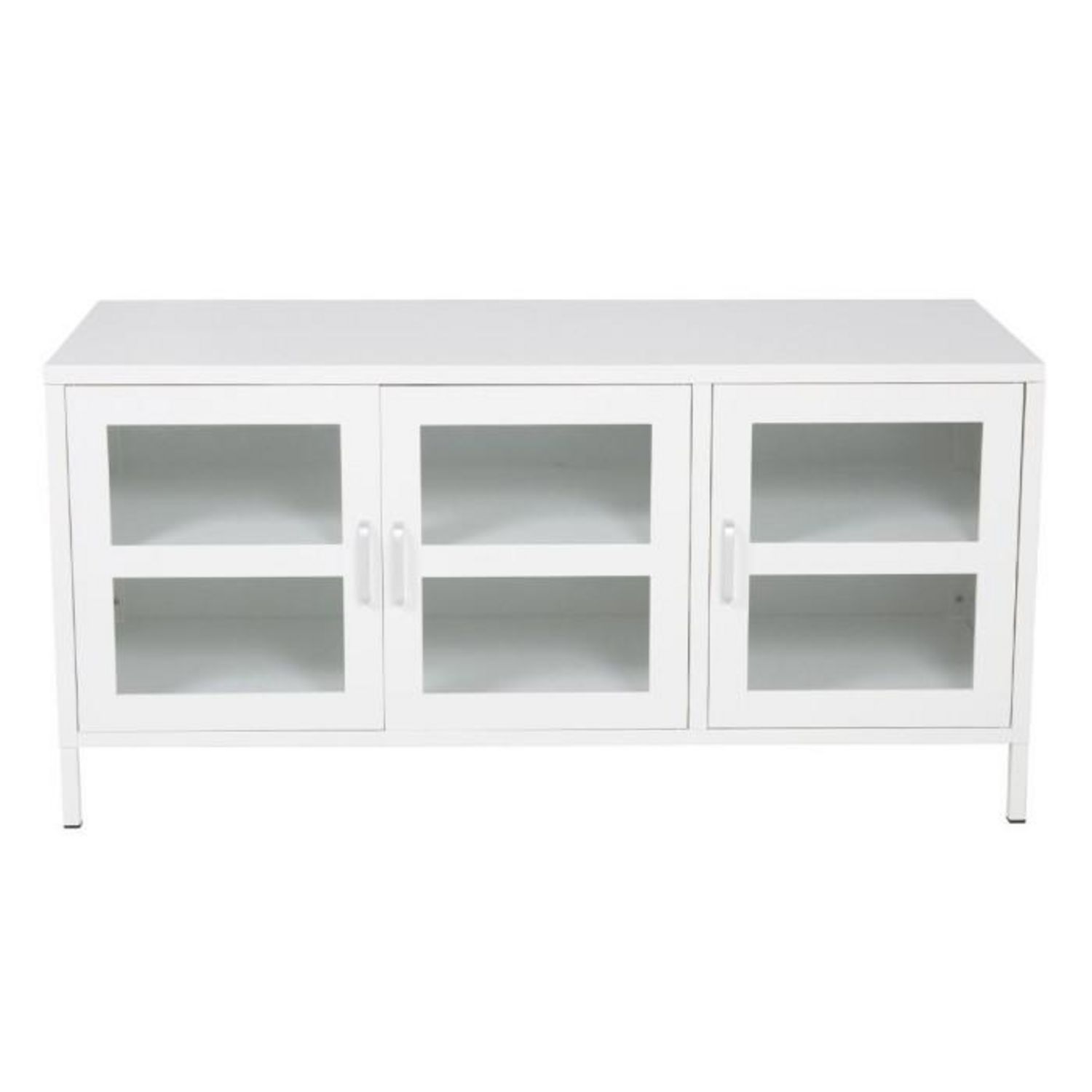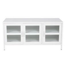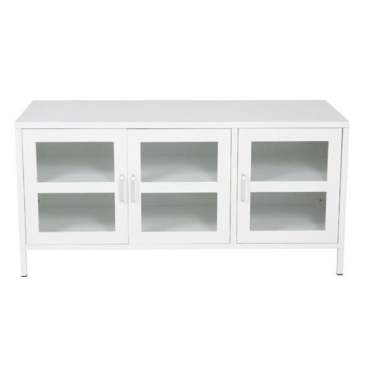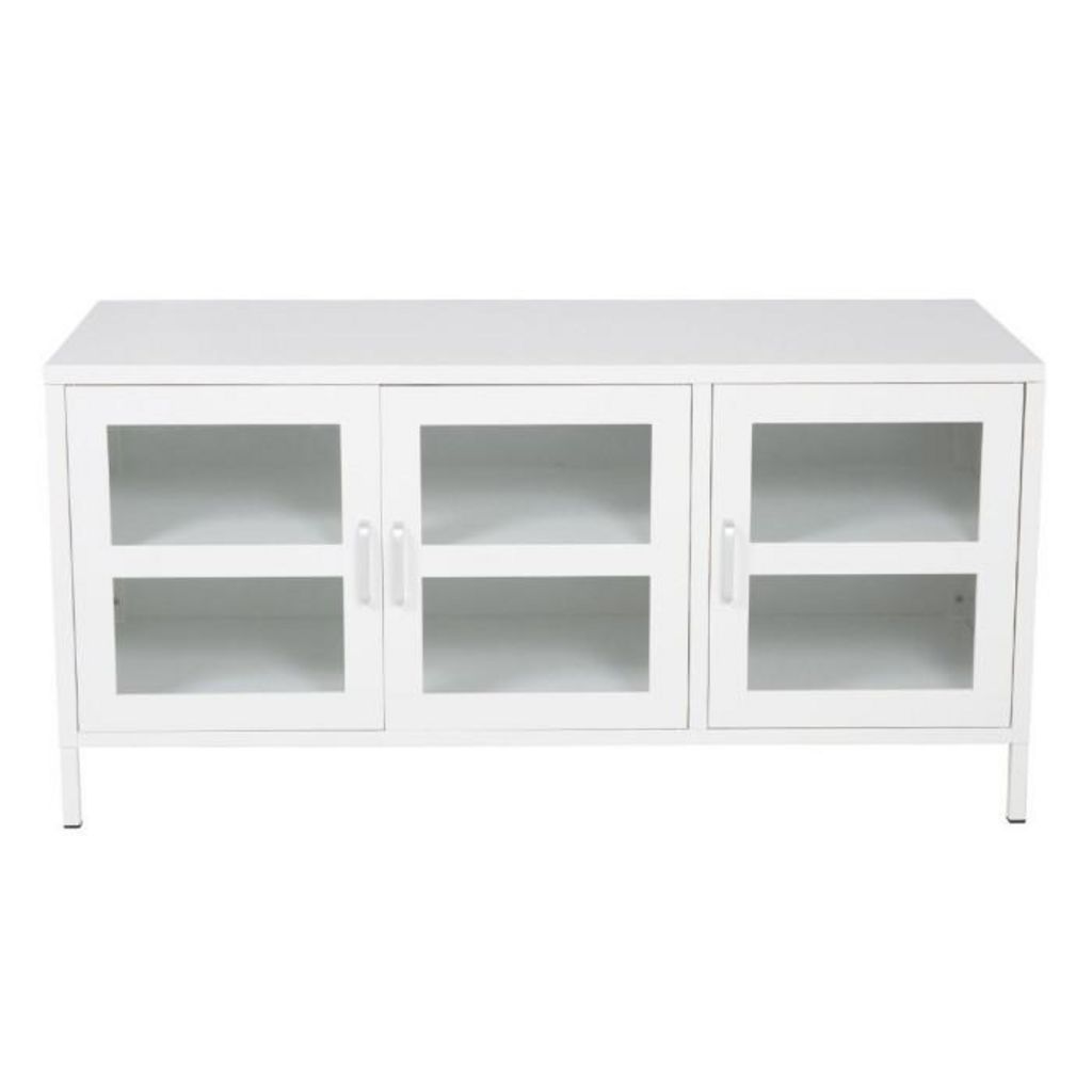 Informations Techniques : Dimensions : L. 120 x l. 48 x H. 58 cm Matières : Acier & Verre Spécificités : Pratique & Élégant Meuble TV sur pied Avec 3 portes vitrées Étagère amovible Nombre de colis : 1 Poids max supporté : 30 kg Poids : 19 kg Couleur : Blanc