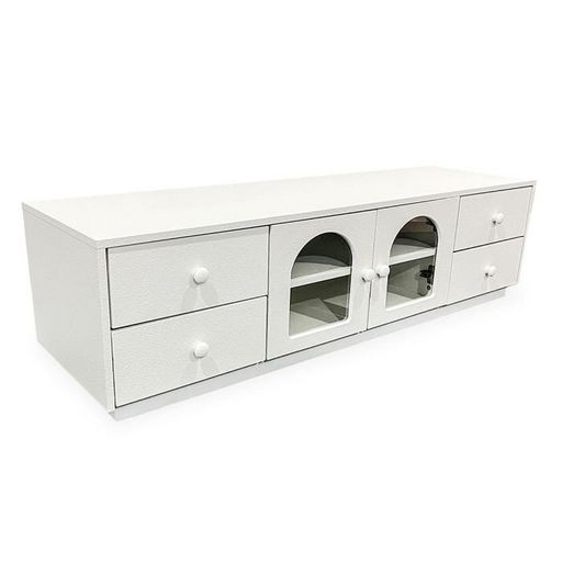 Informations Techniques : Dimensions : L. 140 x l. 40 x H. 39 cm Matières : MDF & Verre Spécificités : Esthétique & Pratique Meuble TV rectangulaire 4 tiroirs et 2 portes vitrées Design effet texturé en relief Nombre de colis : 1 Poids : 30,4 kg Couleur : Blanc