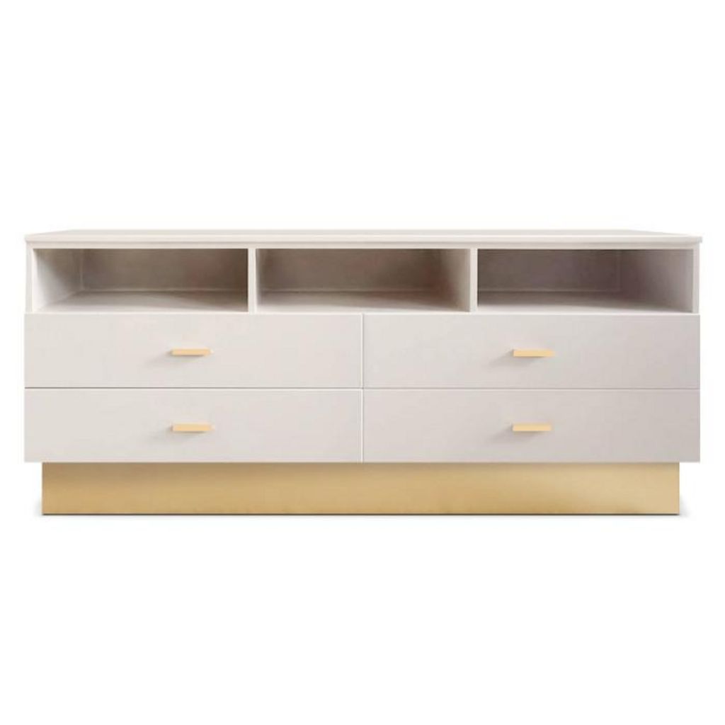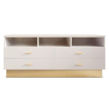 Informations Techniques : Dimensions : L. 150 x l. 40 x H. 65 cm Matières : Bois & Métal Spécificités : Pratique & Tendance Meuble TV Design 4 Tiroirs Forme Rectangulaire Montage facile Nombre de colis : 1 Poids : 36,5 kg Couleur : Taupe Clair & Or