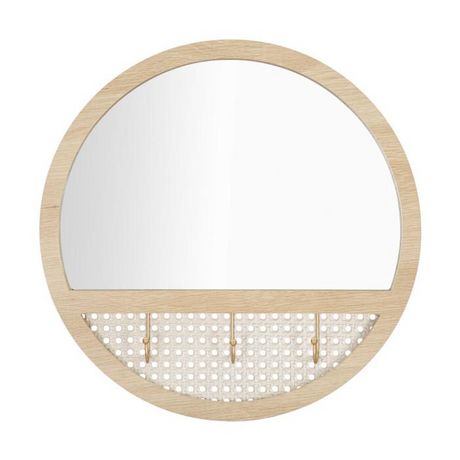 Informations Techniques : Dimensions : L. 50 x l. 5 x H. 50 cm Miroir : L. 45 x H. 30 cm Matières : Métal, Verre & MDF Spécificités : Pratique & Design Miroir mural rond Avec 3 crochets Effet cannage Poids : 1,71 kg Couleur : Naturel