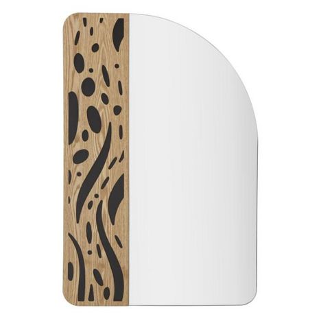 Informations Techniques : Dimensions : L. 60 x l. 1 x H. 90 cm Miroir : L. 40 x H. 90 cm Matières : MDF & Verre Spécificités : Utile & Design Miroir mural Motifs ajourés Forme asymétrique Poids : 6,2 kg Couleur : Naturel & Noir