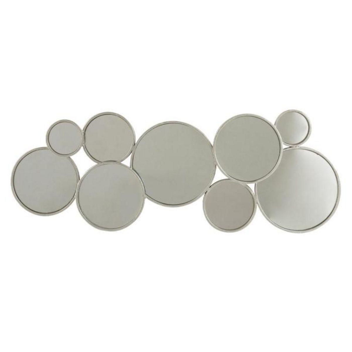 Informations Techniques : Dimensions : L. 84 x l. 5 x H. 31,5 cm Matières : Métal Spécificités : Tendance & Original Miroir Mural design 9 Ronds Poids : 2,32 kg Couleur : Argent