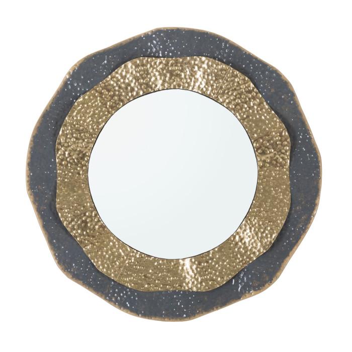 Informations Techniques : Dimensions : L. 65,5 x l. 5 x H. 65,5 cm Miroir: D. 38,5 cm Matières : Métal, Verre & MDF Spécificités : Pratique & Design Miroir mural rond Texture martelée Poids : 1 kg Couleur : Gris & Or