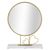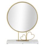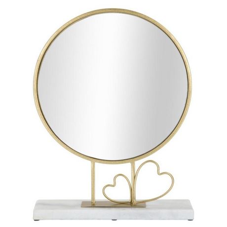 Informations Techniques : Dimensions : L. 30 x l. 9 x H. 39,5 cm Miroir : D. 28,5 cm Matières : Métal, Marbre, Verre & MDF Spécificités : Pratique & Design Miroir rond sur pied Socle en marbre Ornement cœurs Poids : 2,4 kg Couleur : Or & Marbre