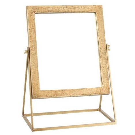 Informations Techniques : Dimensions : L. 46 x l. 34 x H. 20 cm Matière : Métal Spécificités : Tendance & Moderne Miroir sur Pied Forme Carrée A Poser Poids : 3,015 kg Couleur : Or