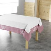 Informations Techniques : Dimensions : L. 240 x l. 140 cm Matières : (57%) Polyester, (33%) Coton & (10%) Fibres diverses Spécificités : Pratique & Tendance Nappe Brodée Convient pour une table rectangulaire Entretien Facile Poids : 0,926 kg Couleur : Rose & Blanc