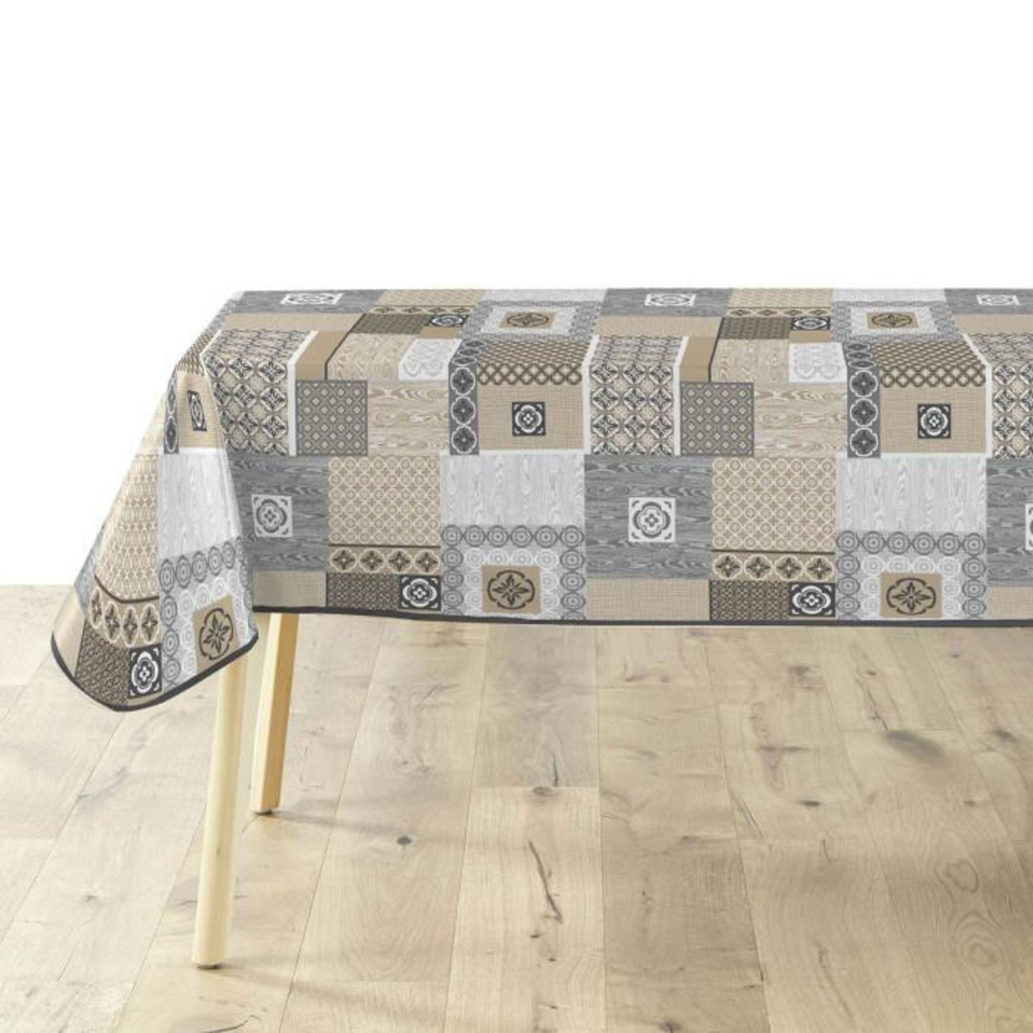 Informations Techniques : Dimensions : L. 240 x l. 140 cm Matières : PVC & Polyester Spécificités : Déco & Utile Nappe de table Motif imprimé Finition biais Pour 8 à 10 couverts Imperméable Nettoyage facile Forme rectangulaire Poids : 1,16 kg Couleur : Beige