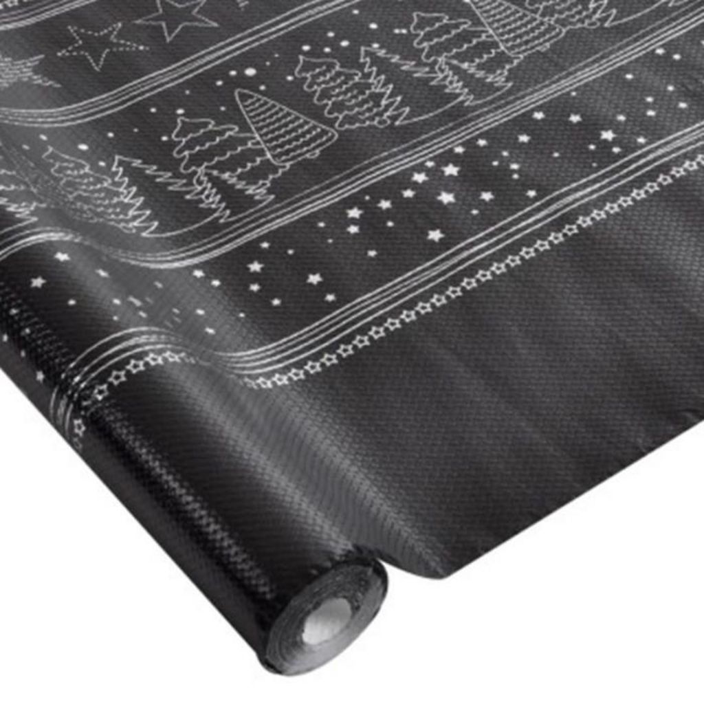 Informations Techniques : Dimensions : L. 5 x l. 1,18 m Matière : Polypropylene Spécificités : Pratique & Efficace Rouleau de Nappe Jetable Nappe imperméable Facile d'utilisation A Motifs Couleur : Noir & Argent