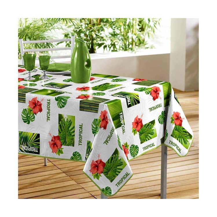 Informations Techniques : Dimensions : L. 240 x l. 140 cm Matières : 88% PVC, 10% polypropylène & 2% polyester Spécificités : Nappe en toile cirée Facile d'entretien Tropical & Tendance Finitions : Biais Imprimés : Plantes & fleurs tropicales Couleur : Blanc