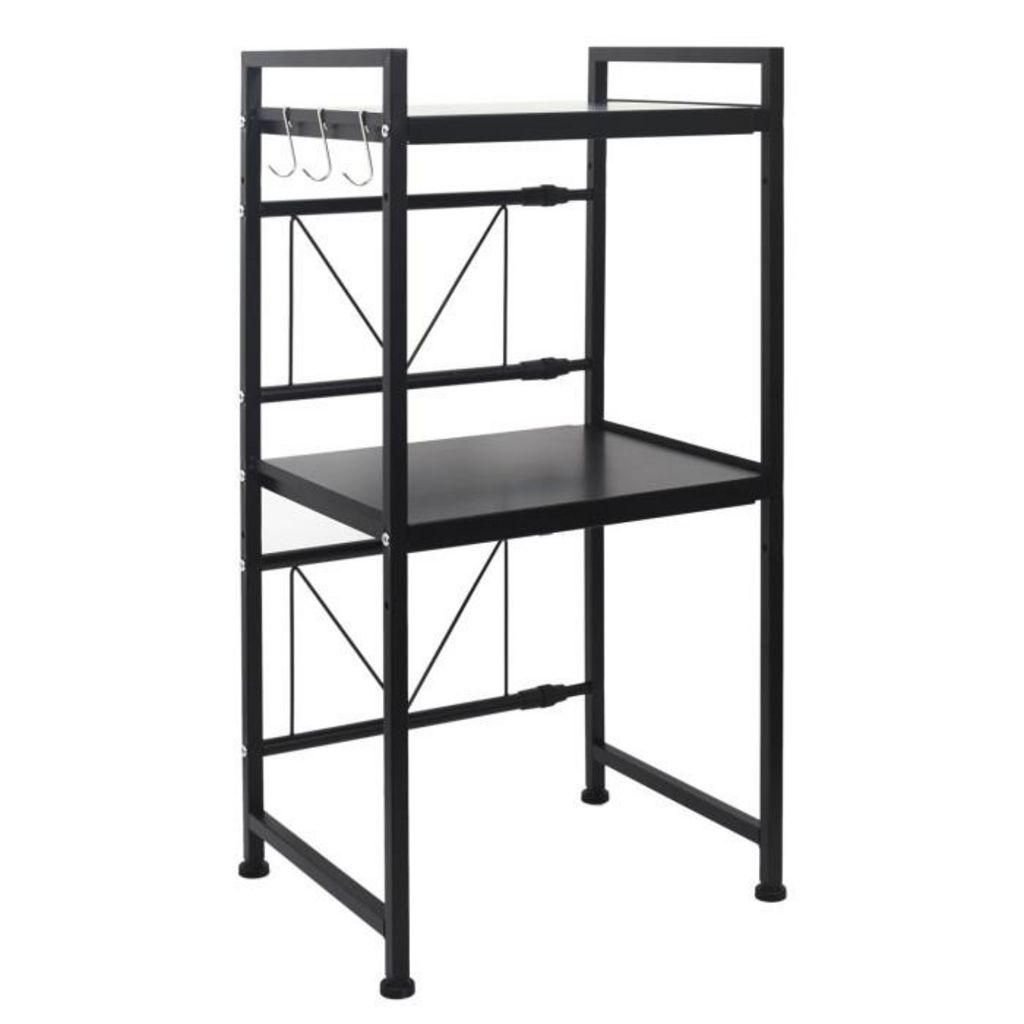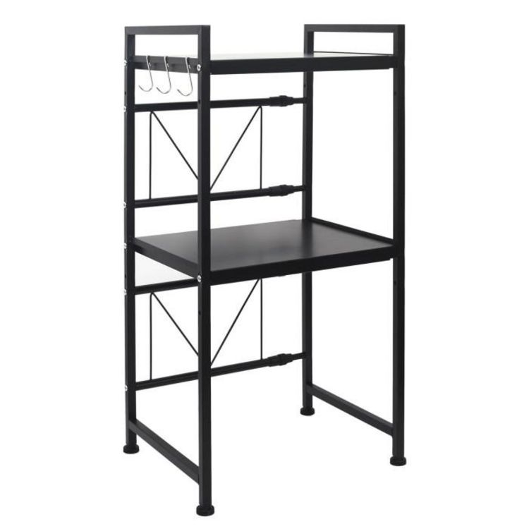 Informations Techniques : Dimensions : L. 40-60 x l. 32 x H. 78 cm Matières : Métal & Fer Spécificités : Pratique & Utile Organisateur Micro-Ondes Modulable Extensible 3 Crochets A Poser Poids : 3,5 kg Couleur : Noir
