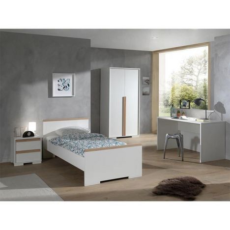 Pack - Lit Enfant, Chevet, Armoire 2 Portes & Bureau London Blanc