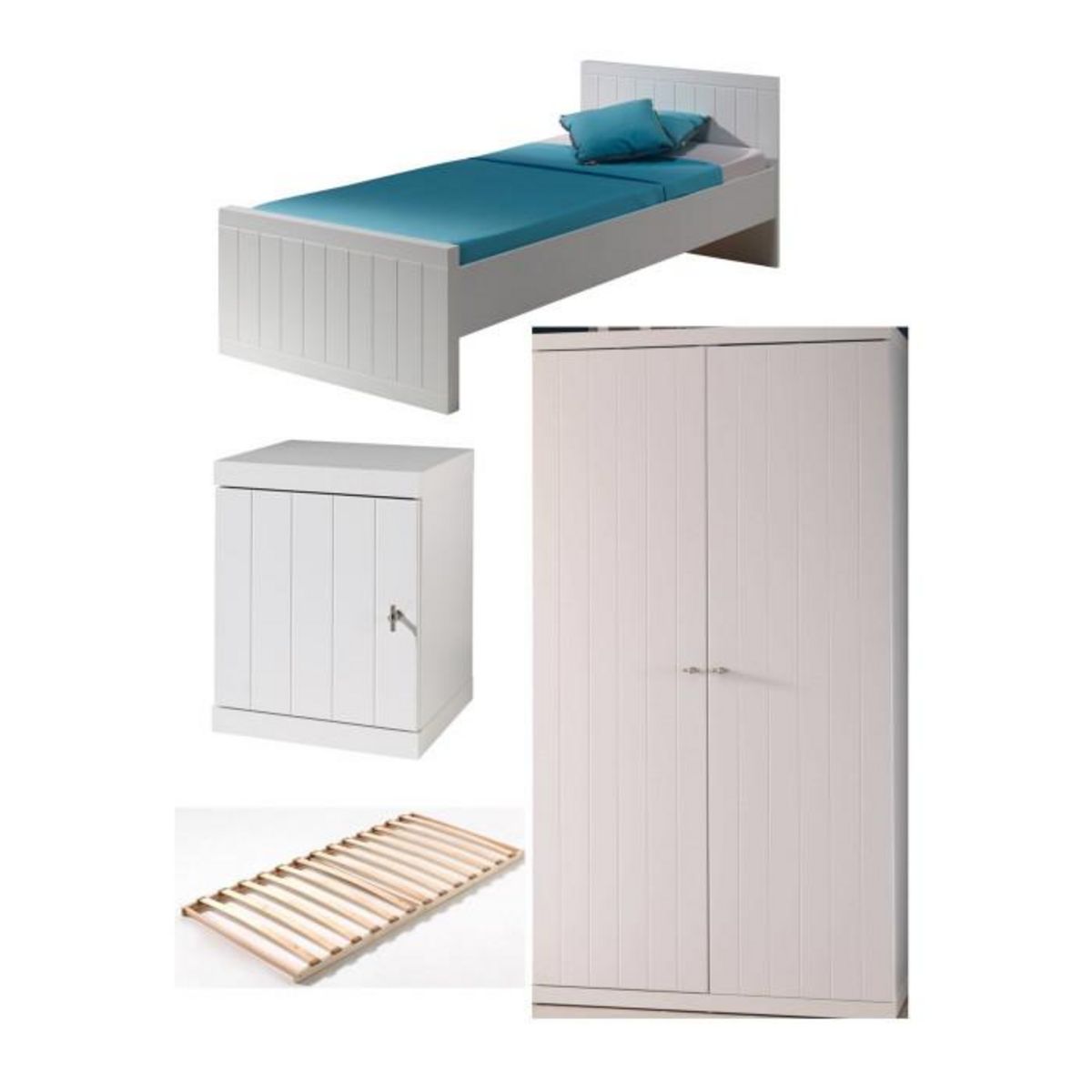 Pack - Lit Enfant, Sommier, Chevet & Armoire Robin 90x200cm Blanc