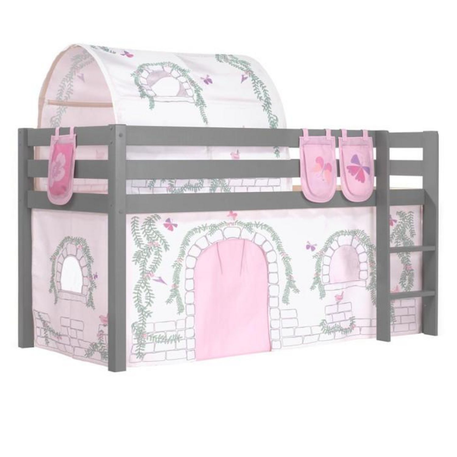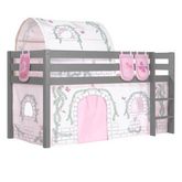 Lit Enfant Surélevé Pino 90x200cm Gris + Birdy Rideau + Tunnel + Pochettes de lit