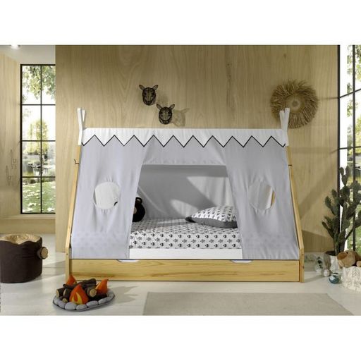 Pack - Lit Enfant, Tiroir & Voile Tipi 90x200cm Blanc & Naturel